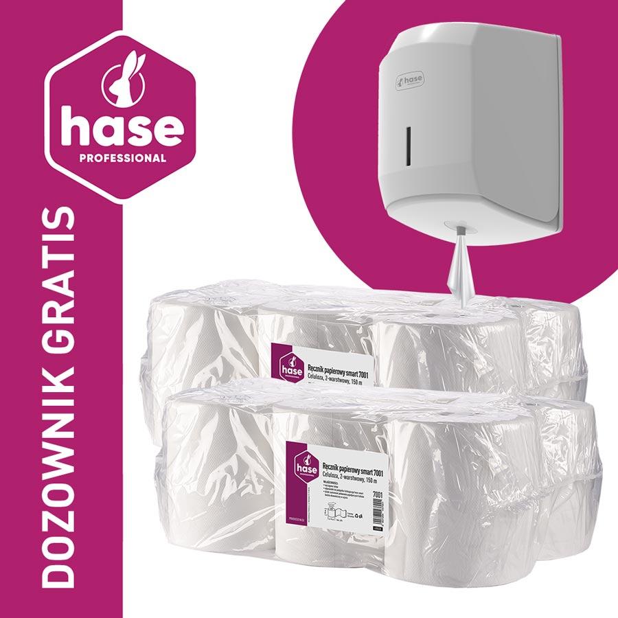 Mamy zaszczyt zaproponować Państwu pakiet, składający się z 12 rolek (2 opakowań) celulozowego, dwuwarstwowego recznika papierowego oraz dozownika, marki Hase.
